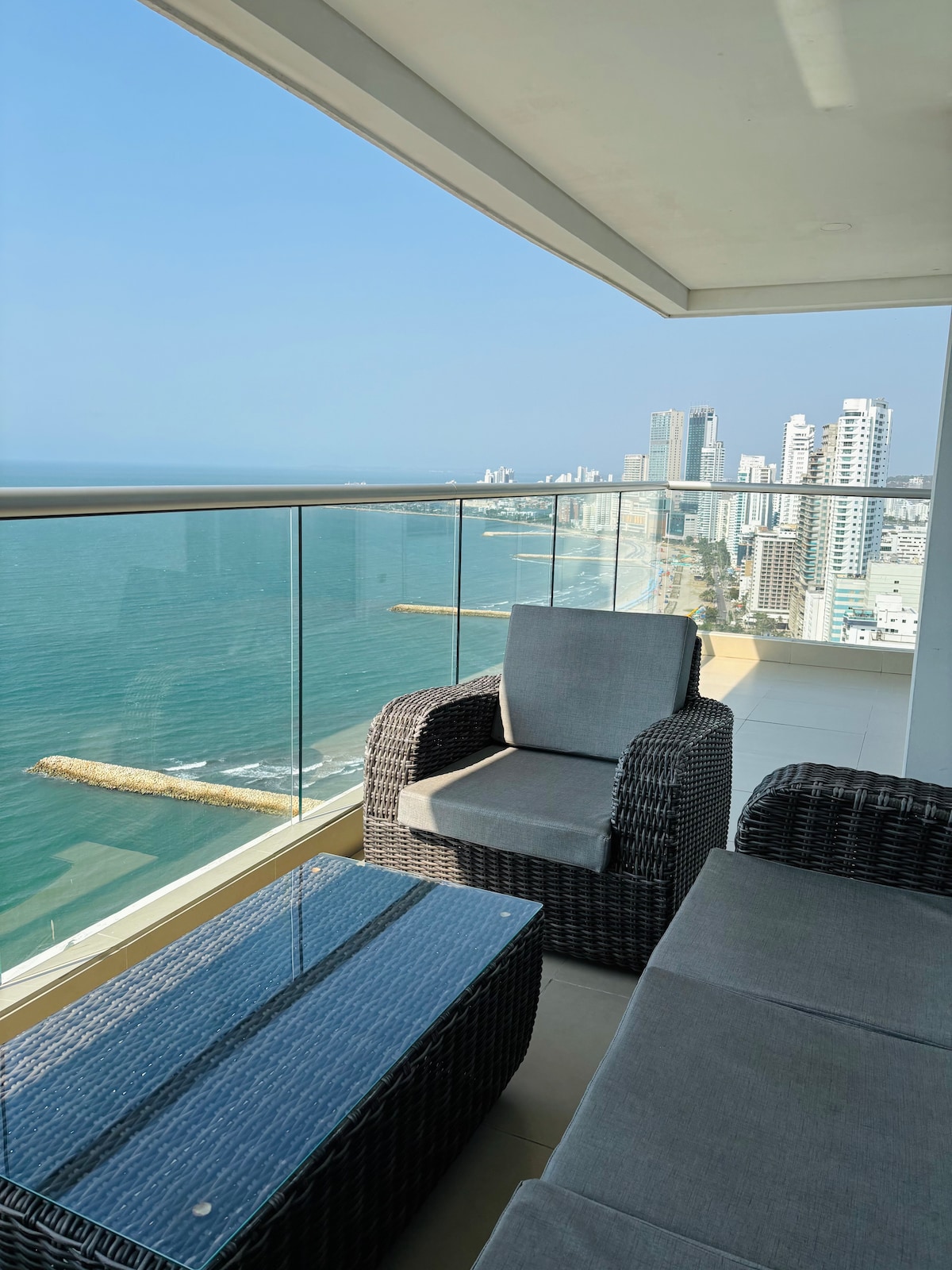 Hermoso y lujoso apartamento en el piso 33 de un nuevo edificio, con espectacular vista hacia la famosa Bahía de Cartagena. Cerca de todo. A cinco minutos del centro histórico, 2.5 cuadras de la playa de Bocagrande,a una cuadra de la Bahía, supermercados cercanos , restaurantes variados, centros comerciales cercanos. El edificio cuenta con piscina, jacuzzi, gimnasio, sauna, 4 elevadores , parqueaderos y futbolín. Bioseguridad , limpieza exhaustiva , fumigacion.
