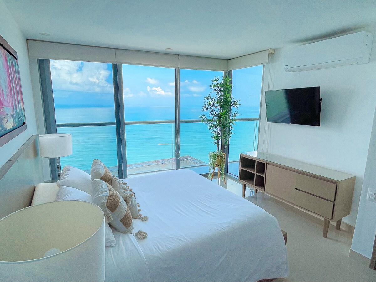 Descubre el lujo elevado en nuestra suite con vista al mar en el piso 34, The ICONZ Sky Residence, ubicada en la zona más segura y exclusiva de Cartagena, a pocos pasos de la playa y a 5 minutos de la ciudad amurallada. Despiértate sobre el horizonte de Cartagena con vistas a través de ventanas del piso al techo y salón en un enorme balcón cómodo. Te ENCANTARÁ: ✨Diseño moderno y aire acondicionado en todo el alojamiento ✨Piscina increíble, gimnasio, sauna, seguridad las 24 horas ✨Servicio de limpieza y conserjería ✨Colchón, sábanas y almohadas de primera calidad ✨Auto registro de llegada las 24 horas con cerradura inteligente ✨Televisores inteligentes