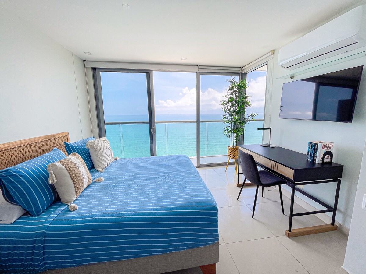 - Hermosas vistas al mar y a la ciudad amurallada. - Totalmente equipado. - 100 % seguro. - Habitación + sala de estar + balcón. - 2 baños con duchas independientes (agua caliente). - Aire acondicionado en todas las habitaciones. - Wifi. - 2 televisores 4K. - ¿Vuelo temprano/tarde? Guardamos equipaje (razonable) de forma gratuita (pregunta con antelación). - Piscina y jacuzzi. - Lavadora/secadora. - Acceso directo a la playa. -Estacionamiento Gratuito - Seguridad 24 horas, 7 días a la semana. - Amplias zonas comunes. - A 20 minutos a pie de la ciudad amurallada. - Si no sabes nada de Cartagena, ¡déjame guiarte!