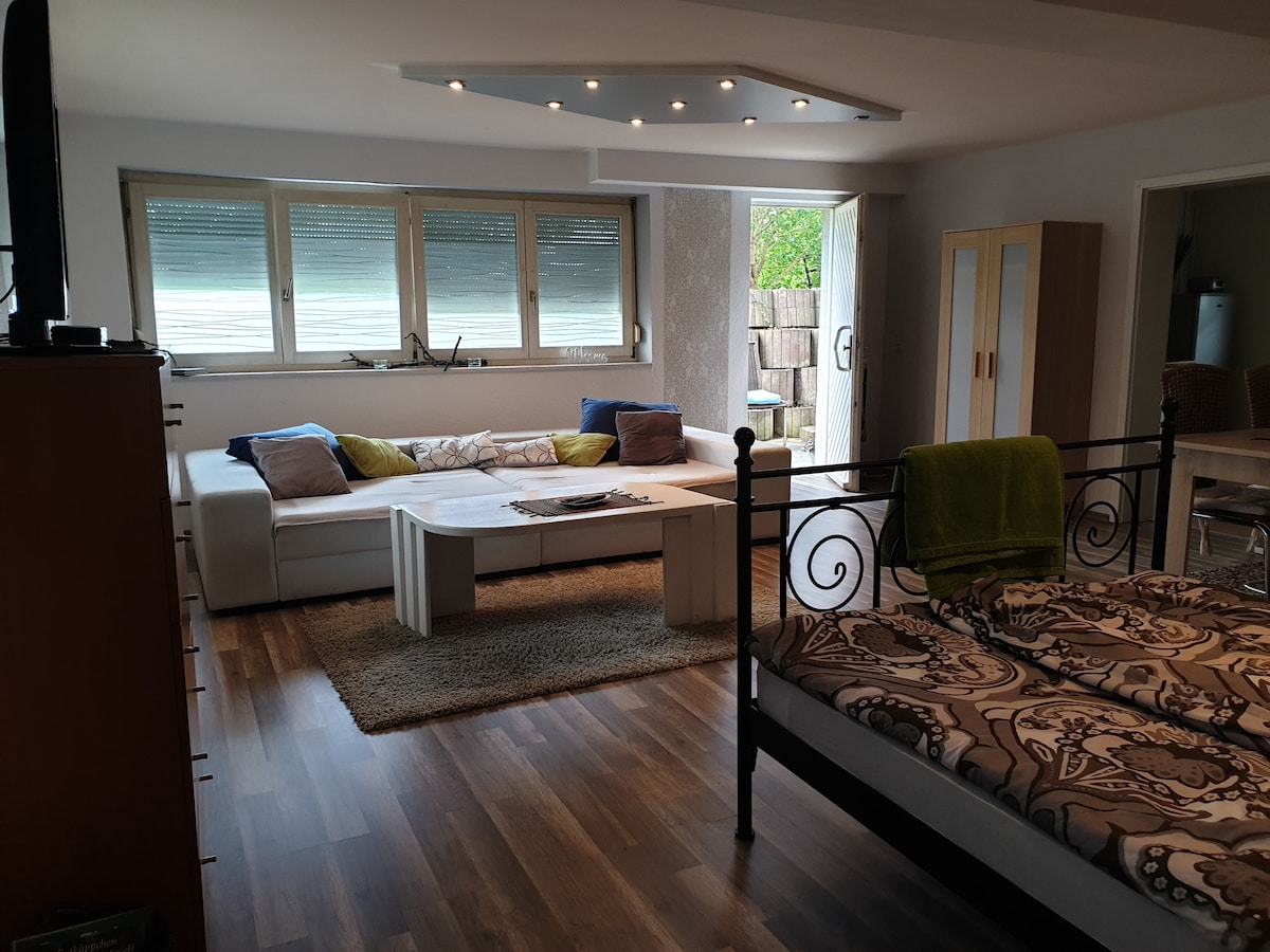 We offer you a modern new 1 room apartment in a quiet and safe area, surrounded by nature. It has a separate entrance for our guests. There is an outdoor area in front of the entrance where you can practice your workout (Yoga, Tai Chi...) undisturbed in the fresh air. The apartment in the basement of our house was equipped with organic vinyl and tiled floors, a new kitchen and a modern bathroom with a large shower.