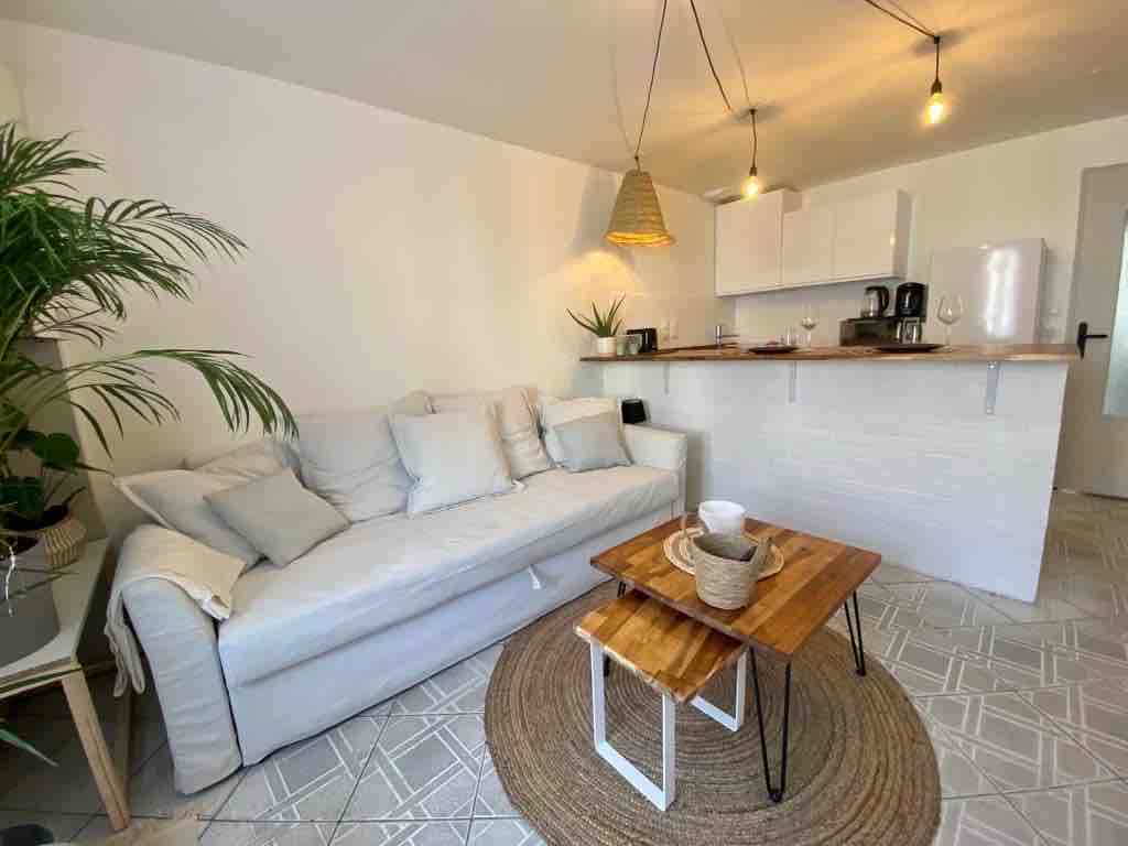 En un edificio antiguo con un patio común (estilo patio) en el centro, este departamento está ubicado en el segundo piso, un pequeño condominio tranquilo. Amplio (60 m²) y muy luminoso. Consta de una gran sala de estar con cocina equipada (horno, microondas, lavadora, TV, etc.), comedor y sala de estar, un dormitorio grande con ropa de cama nueva (tamaño queen), así como un baño con ducha. Los artículos básicos están disponibles. No se permiten fiestas ni reuniones.