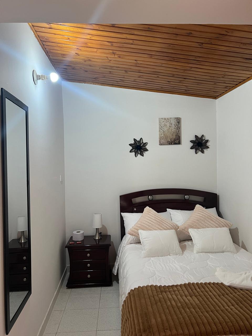 Este acogedor apartaestudio es de uso exclusivo, independiente y privado consta de una habitación amplia, con una cama doble, TV, clóset y mesa de escritorio, baño con agua caliente y una cocineta con nevera la cual tiene lo necesario para cocinar como ollas, loza, cubiertos y otros adicionales. El apartaestudio se encuentra ubicado en la parte de atras de la casa principal, por lo que la entrada es compartida entre ambos. El apartaestudio tiene una buena iluminación, es muy limpio y acogedor