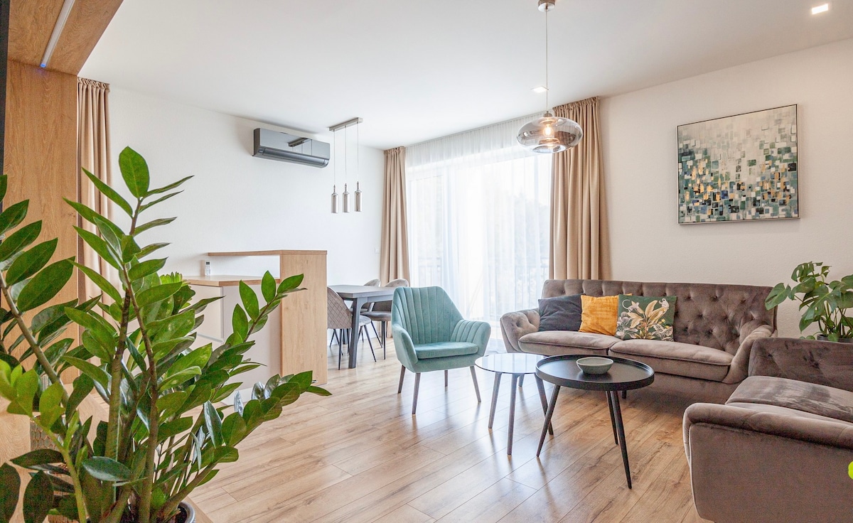 Alójate en un apartamento amplio y luminoso a solo unos pasos del río Nitra. Directamente desde la casa puedes conectarte a un carril bici que te llevará cómodamente hasta Bojnice, a pie, en bicicleta o en scooter. En el camino, puedes relajarte en negocios populares como Meridiana Bojnice, Dráčik o varios cafés elegantes cercanos. Justo al lado de la casa encontrarás una gran pizza napolitana, y el centro comercial Korzo también es accesible a pie. El apartamento ofrece una gran sala de estar con home theater, Netflix e Internet rápido.