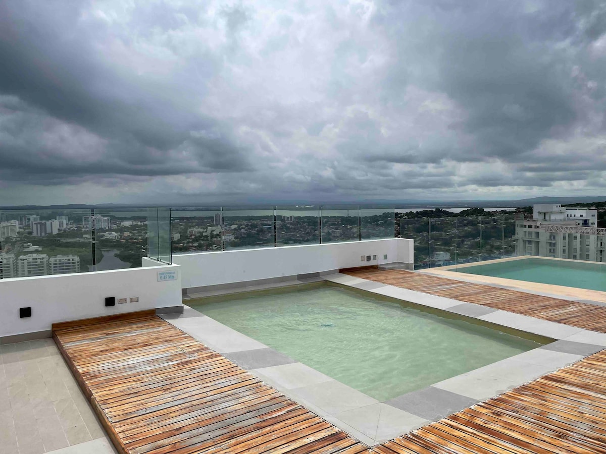 Recién renovado apartamento con vista única al mar y zona de piscinas, aire acondicionado en todos sus espacios, internet de alta velocidad en fibra óptica, ubicado a 5 minutos del aeropuerto, a 10 minutos en taxi de la ciudad amurallada y con acceso directo a las mejores playas de Cartagena, cuenta con gimnasio en las zonas comunes. Ubicado en la zona norte (morros) de hoteles como Holiday Inn, Radisson, Sonesta, Las Americas