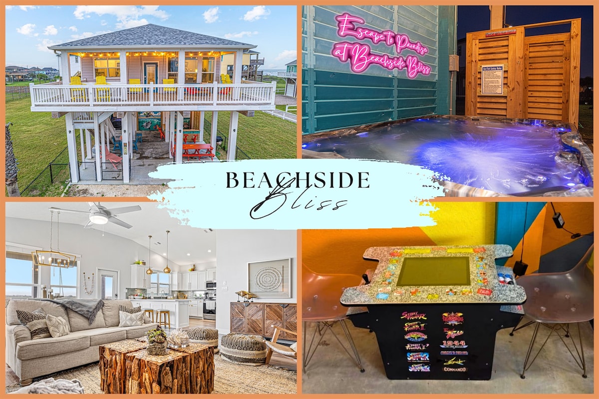 BEACHSIDE BLISS es una lujosa e impresionante casa de campo ubicada a solo unos pasos de la playa, que ofrece impresionantes vistas panorámicas al mar. Esta lujosa casa es ideal para reuniones familiares, donde podrás disfrutar de la brisa fresca del océano y del relajante sonido de las olas. El balcón ofrece espectaculares vistas del amanecer y el atardecer y es ideal para ver las luces de Galveston por la noche. ¡Ven a pasar un rato aquí en BEACHSIDE BLISS!