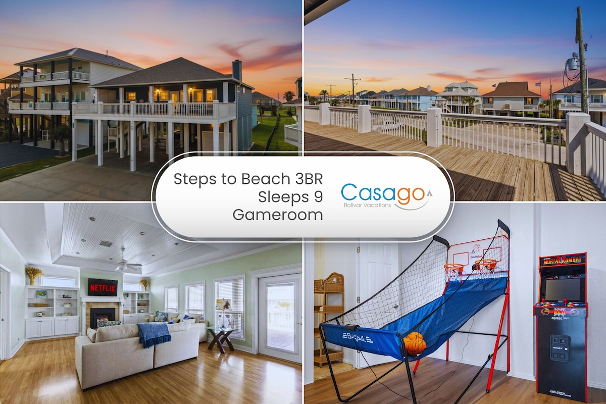 BEACHSIDE BLISS is a luxurious and stunning cottage located just a few steps from the beach, offering breathtaking panoramic views of the ocean. This luxury home is great for family gatherings, where you can enjoy the fresh ocean breeze and the soothing sound of waves. The balcony provides spectacular sunrise and sunset views and is ideal for viewing Galveston lights at night. Come spend some time here @ BEACHSIDE BLISS!
