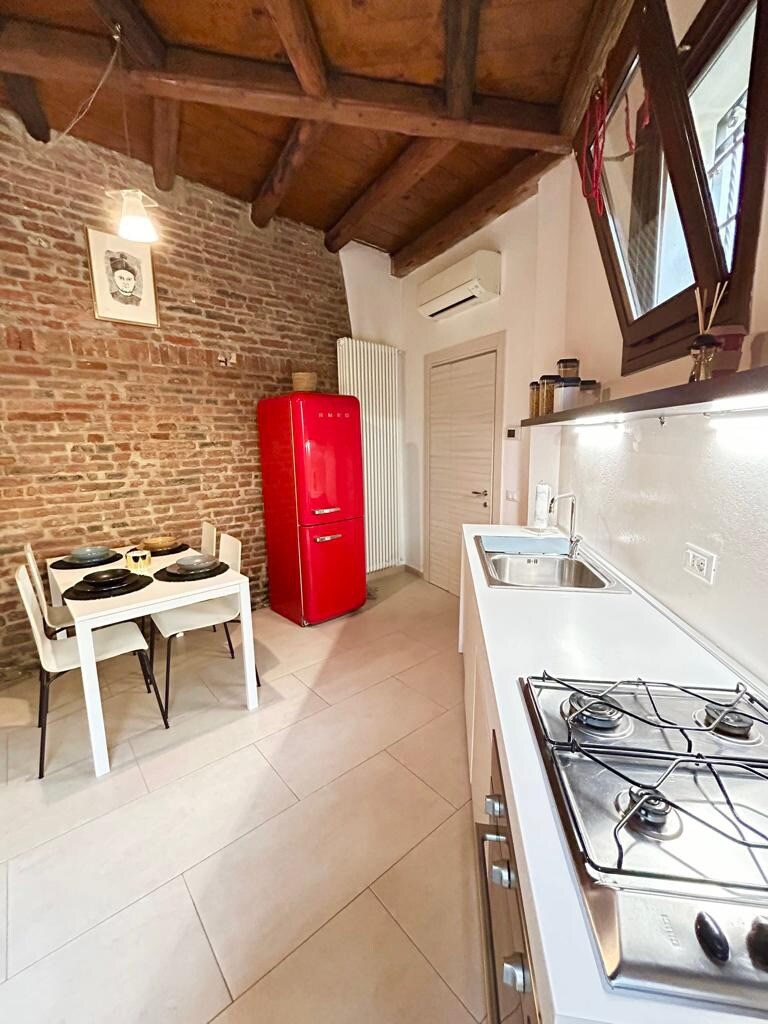 Enjoy a stay in this historic house in the heart of Ferrara’s former Jewish Ghetto with stunning views of the city's medieval skyline and a stone's throw from both the cathedral & fine Michelin dining. A top floor apartment, it features a very large master bedroom, a king size bed & a separate living room. It also includes a new smart tv, lounge area, fully equipped kitchen and a modern bathroom. The apartment is located on the third floor. Do note there is no lift. Bikes included!