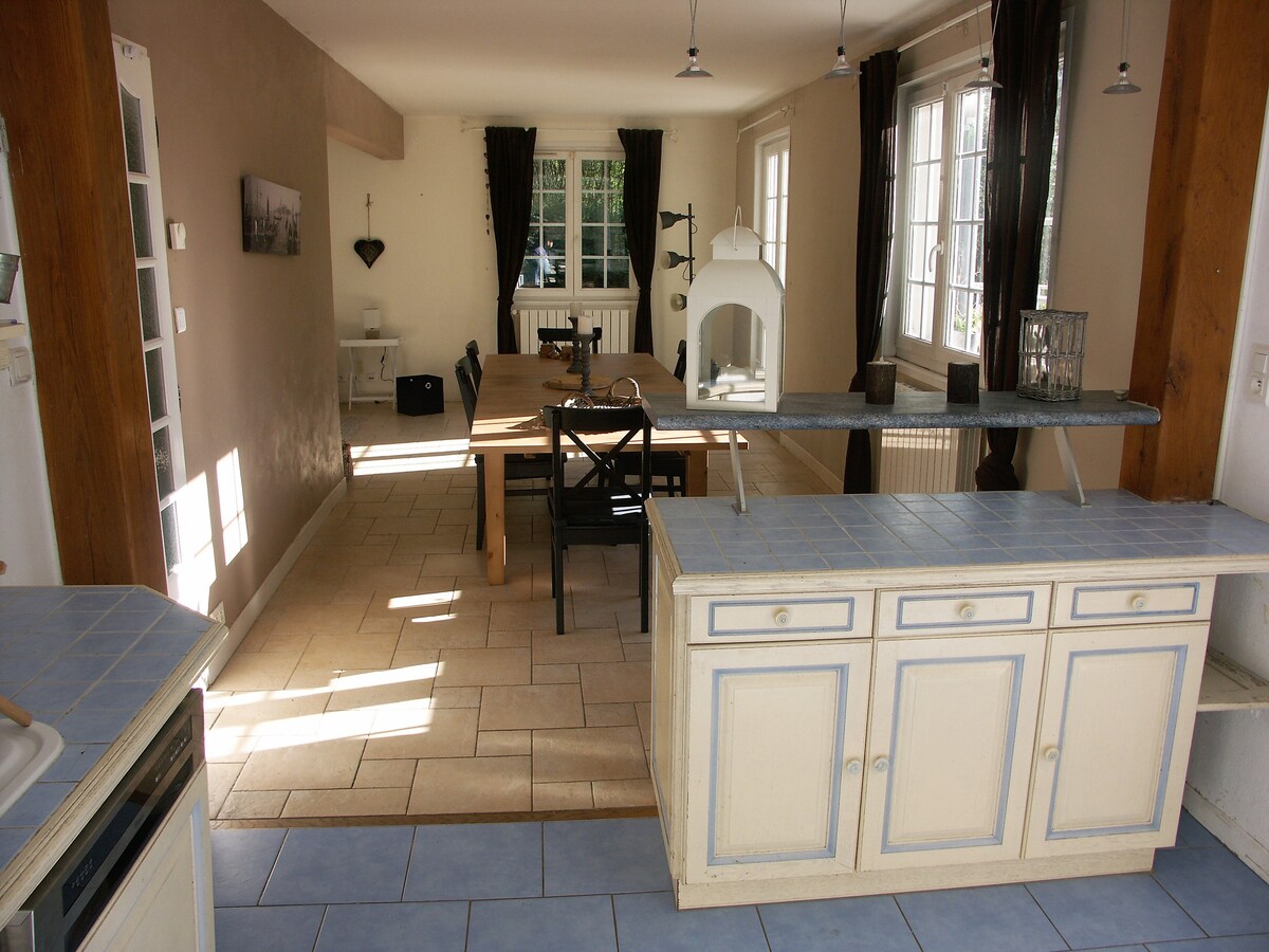 Casa familiar en un jardín de 6000 m² con parte arbolada. Ideal para una estancia familiar con niños o vacaciones con amigos (capacidad máxima de 7 adultos o niños + 1 bebé) Cocina equipada abierta a la sala de estar con sala de estar y chimenea. Barbacoa. Sótano completo y zona de lavandería. Cabaña de jardín a la que los niños pueden ir Juegos de mesa y juegos al aire libre disponibles. Cerca de Beuzeville (a 10 minutos), Honfleur (a 20 minutos), Deauville-Trouville (a 30 minutos)