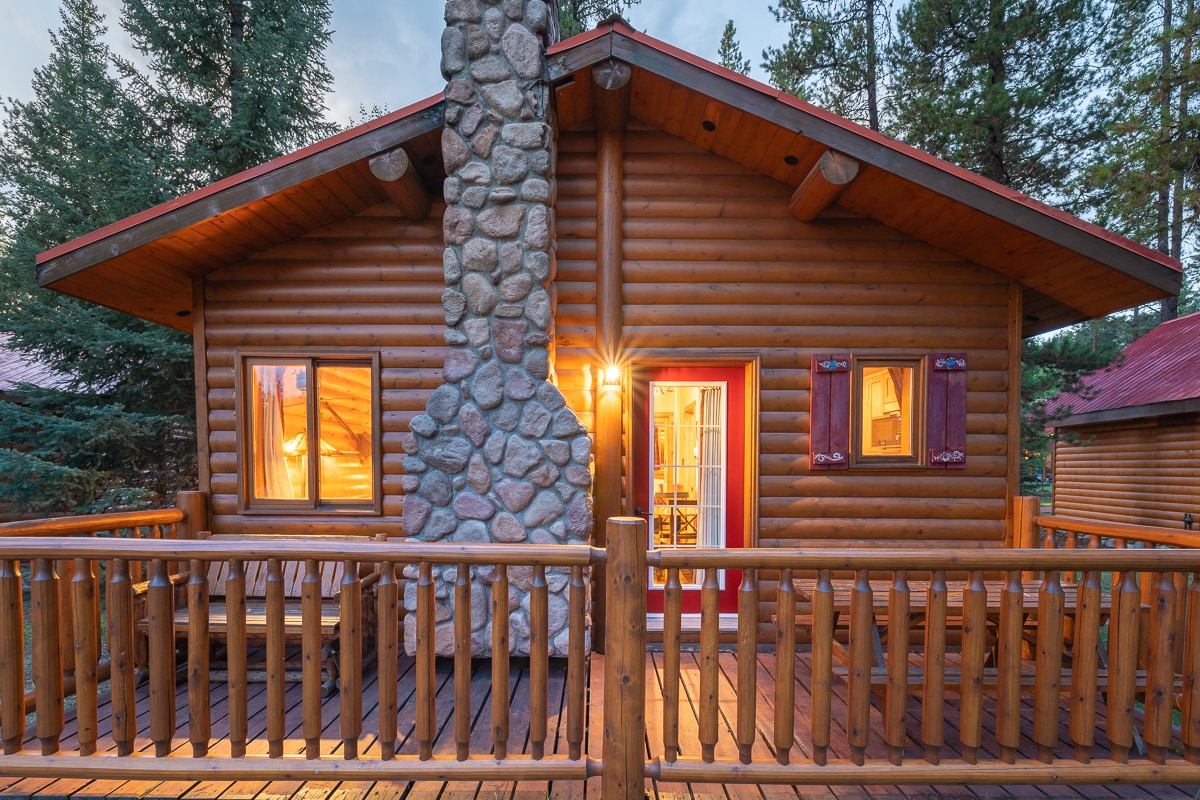 Discover our renovated Superior Jacuzzi Suite with a two-person jacuzzi tub in the open loft that also features a king size log bed. A queen size log bed is in the second bedroom on the main level. There is a seating area with a pull-out sofa and river rock fireplace, two balconies, and mountain views. The kitchenette has an induction stovetop, oven, microwave, mini-fridge, kettle, French Press, and Chemex. We provide hairdryer, shampoo, heat, and private entrances for all suites and cabins.