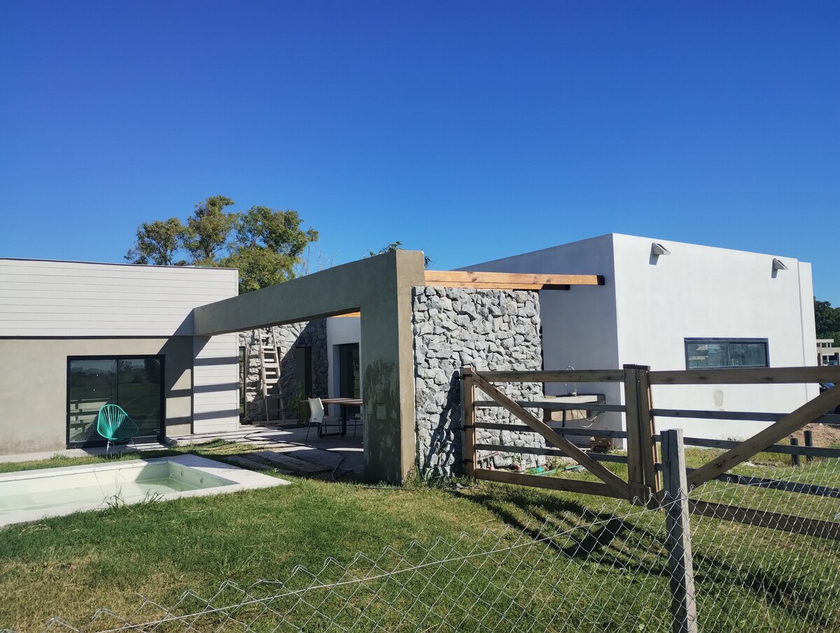La casa ofrece comodidades modernas y una experiencia funcional. Disfruta de 2 habitaciones cómodas, un amplio parque arbolado con piscina así como una galería perfecta para relajarte y disfrutar del jardín. Con cocina totalmente equipada, ducha escocesa, wifi y TV con ChromeCast. Con capacidad para 5 personas te invitamos a disfrutar del aire puro y contemplar la naturaleza mientras disfrutas de un asado tradicional de campo.
