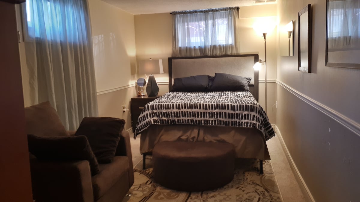 This gorgeous newly renovated basement apartment has bright windows throughout and an amazingly comfortable KING SIZE bed in the master bedroom. It also has a futon for that extra guest. It has all the amenities you need to enjoy your stay in the heart of Kitchener-Waterloo just steps from uptown and downtown. The kitchen is well prepared to create a gourmet dinner and blazing fast wifi is ideal to work at the desk or to watch a movie. We have a relaxing outdoor space for you to enjoy as well.