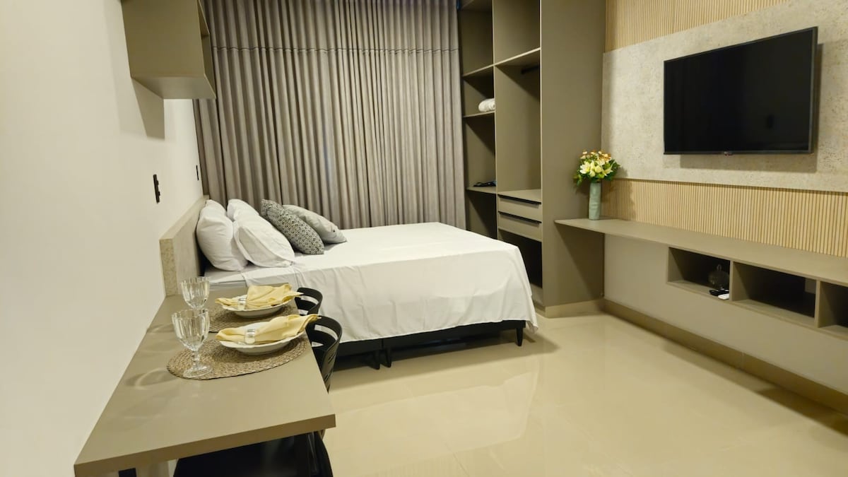 Descubra um refúgio de elegância e conforto próximo á faculdade de medicina Uni evangélica e hospitais em Anápolis. Este estúdio exclusivo foi projetado para oferecer uma experiência inigualável, cada elemento traduz sofisticação e bem-estar. Cada estadia é um convite para viver momentos de puro requinte, em um ambiente que inspira tranquilidade, estilo e prazer. Seja para relaxar ou trabalhar. Bem-vindo ao seu refúgio de luxo em Anápolis.