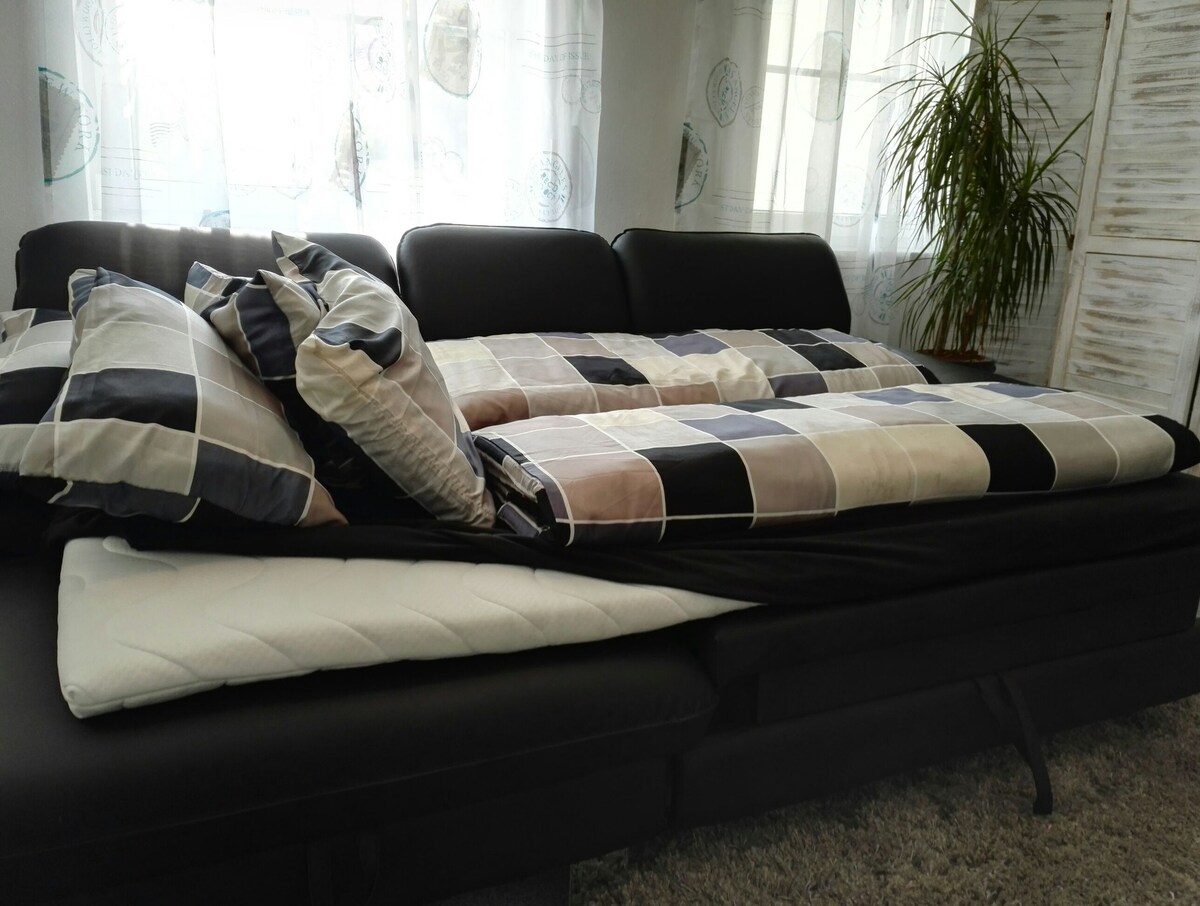 Alquilamos nuestro moderno apartamento independiente con 40 m² de superficie habitable. ¡Prestamos especial atención a la higiene y desinfectamos después de cada huésped! Planta baja - 1,5 habitaciones con cocina americana, baño e entrada independiente. El apartamento está equipado con una cama individual de 120 cm x 200 cm en el dormitorio y un moderno sofá cama plegable que incluye un cómodo cubrecolchón de aproximadamente 120 cm x 190 cm. Almohadas, mantas, ropa de cama y toallas, nevera con congelador, vajilla, tostadora, cafetera Senseo,