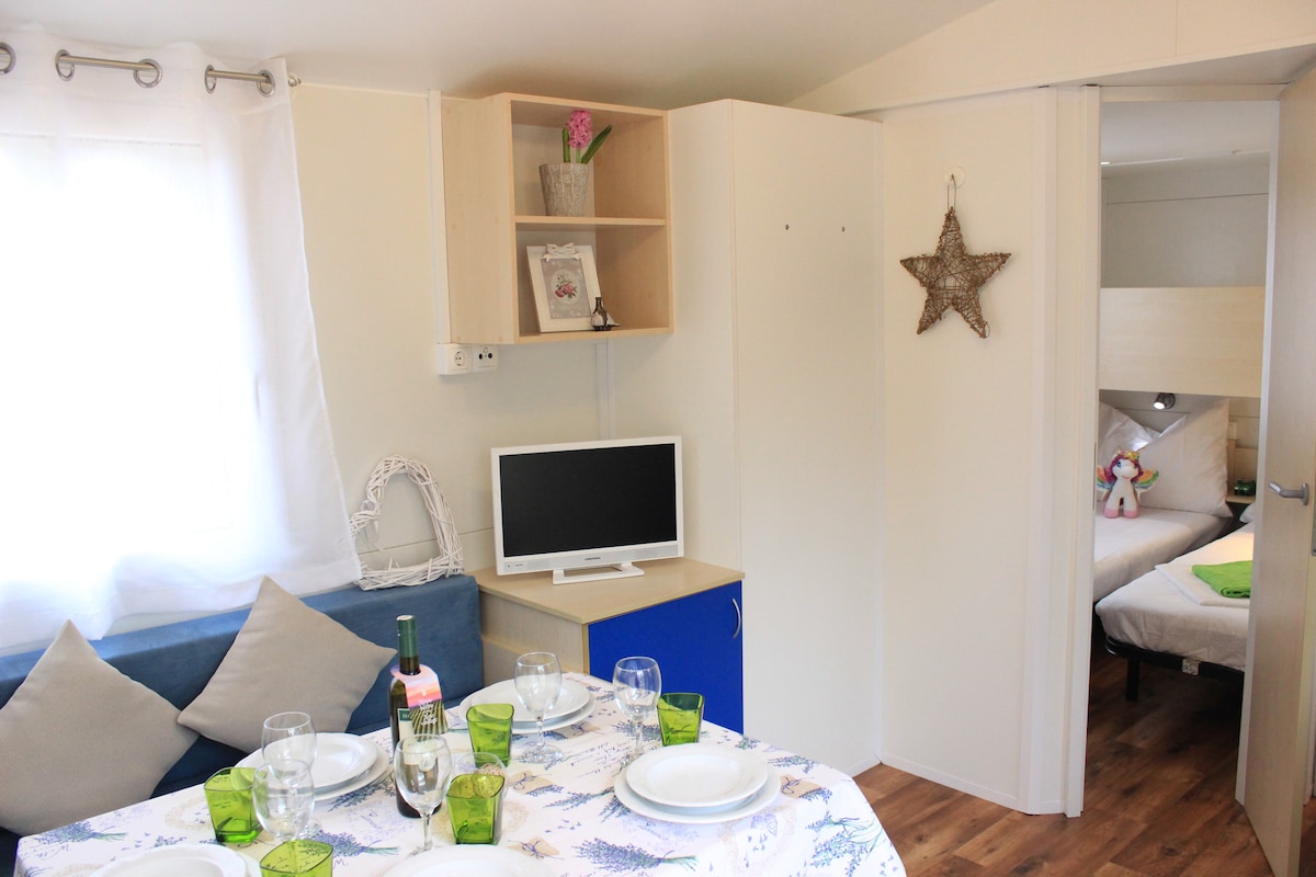 Casas móviles situadas en un hermoso campamento, junto al mar. Dimensiones 8x 3m, 2 dormitorios, aseo y baño , cocina totalmente equipada. La más hermosa es la terraza justo al lado del mar (algunas son casi terraza sobre el mar) - simplemente disfrutar de sus vacaciones.