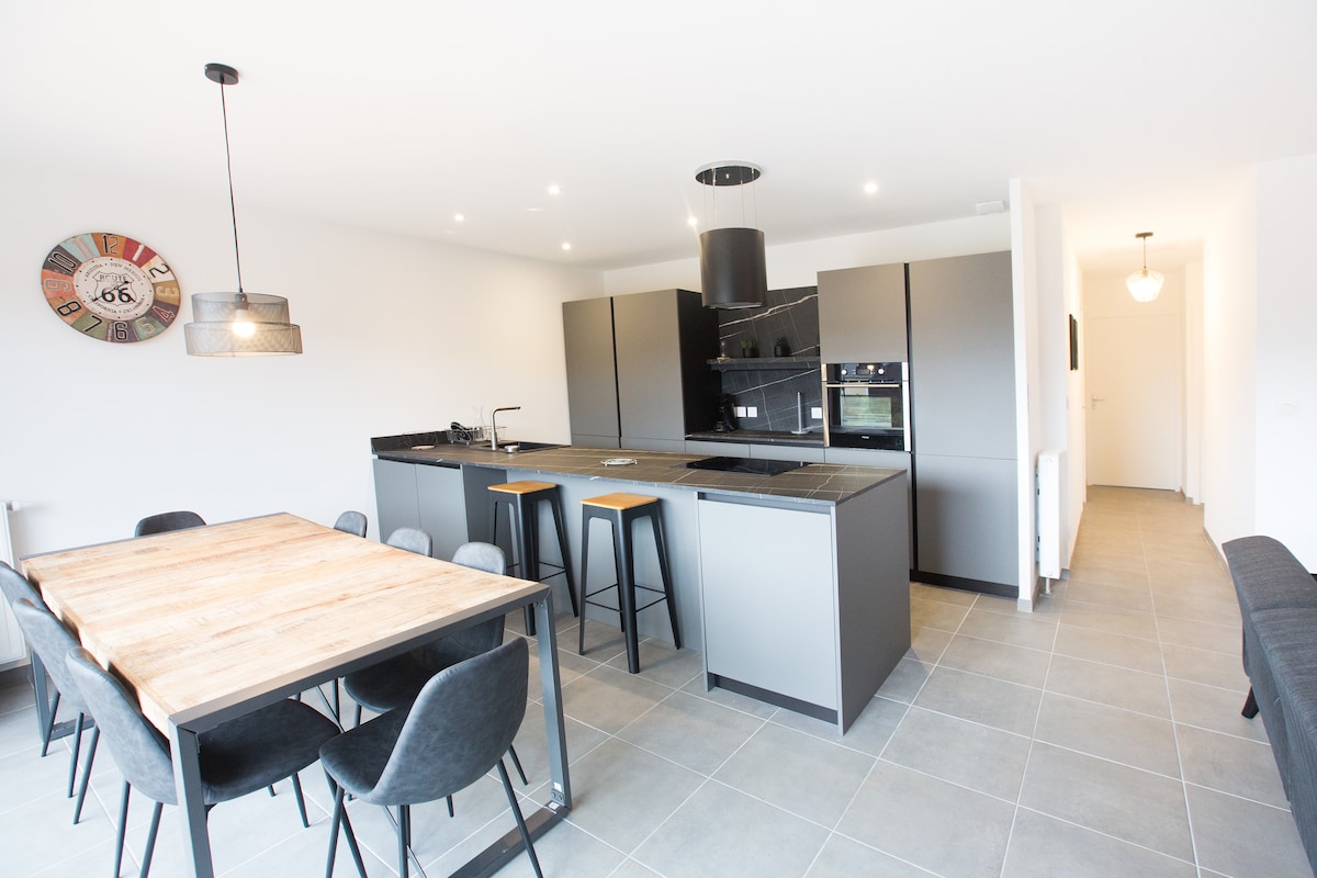 Amueblado de turismo de alta gama. Villa contemporánea nueva (2022) de 120 m2 en una sola planta situada a menos de 100 m del mar a 5 minutos de los comercios de Saint Germain sur Ay, a 8 minutos de Portbail y a 15 minutos de Barneville-Carteret. Casa totalmente equipada con Wi-fi en una parcela de 800m2, que consta de una hermosa y cálida sala de estar con cocina abierta, comedor y sala de estar con TV, sauna, dos baños, 3 dormitorios dobles y un dormitorio con dos camas twin.