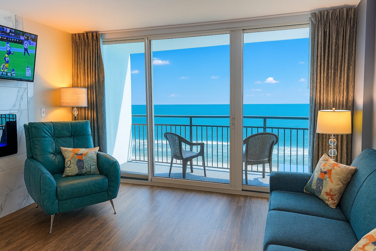 This Beautiful 1BR, 1BA Oceanfront Suite, sleeps 5 and is very spacious. 1st floor with private balcony and stunning Oceanfront view. 1Br with King bed, living room has a pull down murphy and sofa sleeper. Granite counters in both kitchen & bath with a large shower and full efficiency kitchen. 2 TV's, wifi, Iron, blow dryer, 2 pools indoor/outdoor, 2 Jacuzzi's indoor/outdoor, lazy river, lawn chairs/umbrellas and a quick walk to the beach. Ask about our honeymoon/anniversary packages we offer.