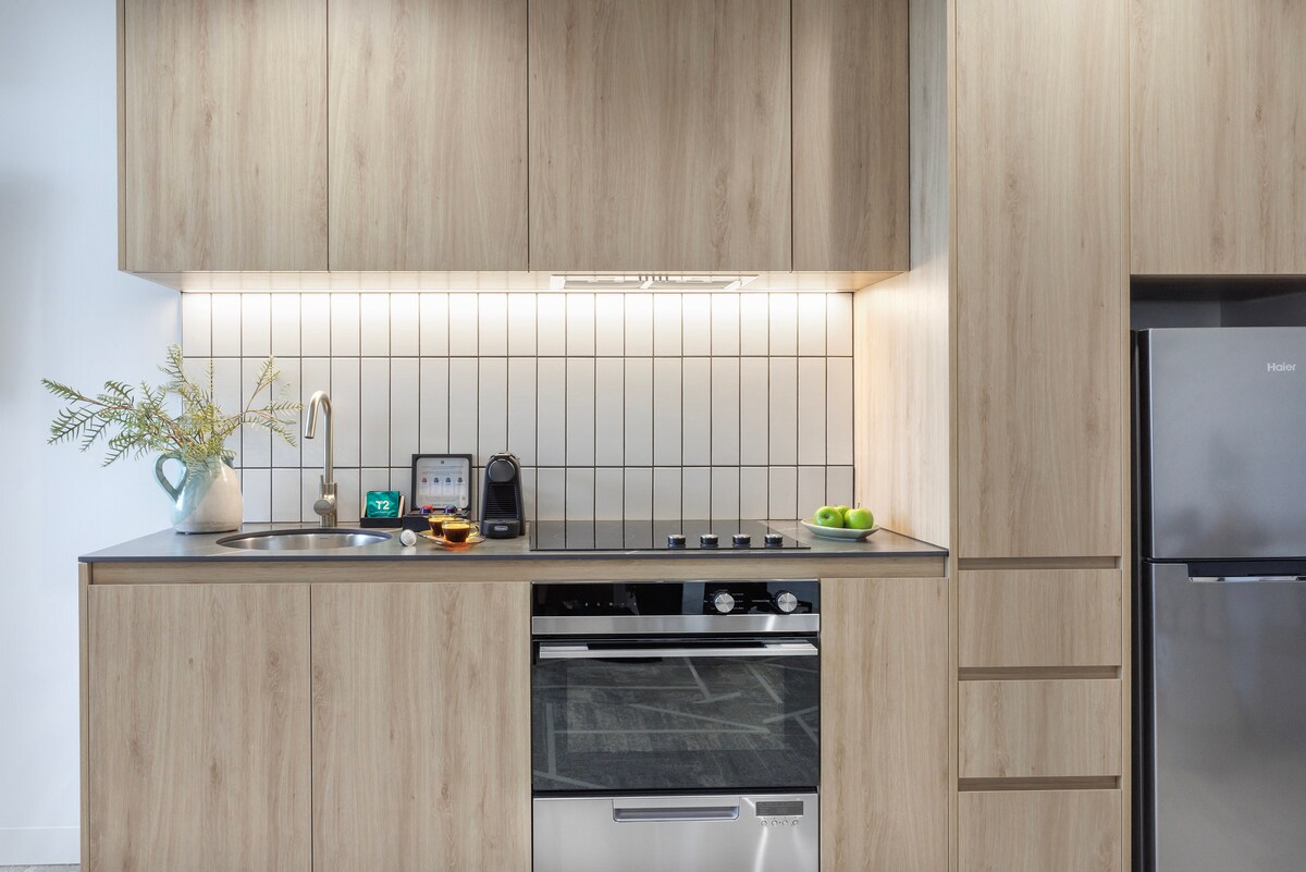 Al fusionar dos apartamentos tipo estudio, nuestros apartamentos tipo estudio interconectados cuentan con muchas características para garantizar tu máxima comodidad durante tu estancia. Cada habitación tiene una cocina todo incluido equipada con nevera, estufa, microondas, horno y utensilios de cocina. Esta habitación también cuenta con dos baños separados con lavadora y secadora en la habitación, TV, escritorio y wifi de cortesía para mantenerte conectado.