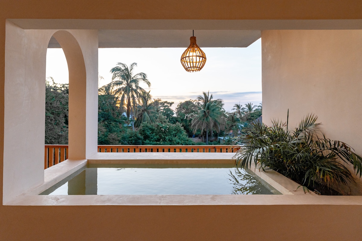 Acogedora suite con cama Queensize, Smart TV, Aire acondicionado, ventilador de techo, cocina, baño y jacuzzi privado. Disfrute de los atardeceres y relaje su mente mientras contempla la vista panorámica de la ciudad, el océano y las montañas desde su jacuzzi privado. Nos encontramos en Punta Zicatela, a 7 minutos caminando de la playa, principal punto de surf, restaurantes, bares y zona comercial. Cerca de todo, pero fuera del bullicio de la fiesta. Contamos con Internet Starlink.