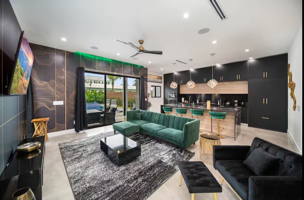 ¡Saluda a esta hermosa casa de Florida! Este espacio de lujo incluye 2 salas de estar abiertas, una cocina moderna con asientos en la parte superior del bar, oficina, 3 amplios dormitorios, 4 baños completos y una casa con piscina con sauna. Los huéspedes también disfrutarán de un oasis privado en el patio trasero que contiene piscina, spa climatizado, tumbonas, chimenea, comedor, cocina al aire libre con fregadero, mini nevera, parrilla para barbacoa y una cancha multi deportiva de tamaño completo y campo de fútbol.