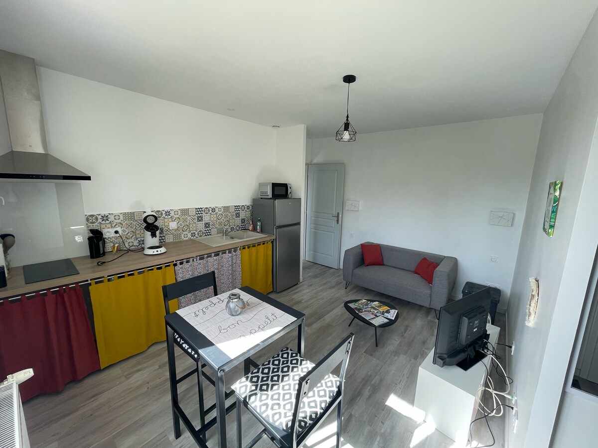 Petite maison de 20 m2 , en pleine campagne. Restaurée avec soin, elle comprend un séjour équipé d'un canapé lit 2 places, d'une kitchenette et d'une salle de bain chaleureuse type chalet. Elle dispose d'un poêle à bois. Elle profite d'un espace ombragé équipé d'un barbecue et d'un salon de jardin et d'un espace qui s'ouvre sur un large paysage de campagne. Un ruisseau longeant la praire, des chemins de randonnées et le village médiéval à proximité invitent à la balade .