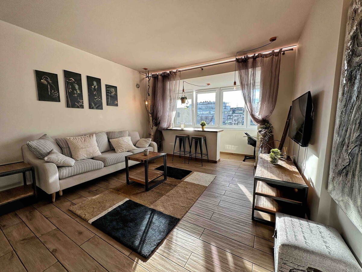 Apartamento artístico de 1 dormitorio totalmente renovado, ubicado en corazón de Bucarest. El lugar cuenta con las instalaciones a las que uno está acostumbrado en los apartahoteles premium, con una impresionante vista al río. Disfruta de una fabulosa vista del Palacio del Parlamento (segundo edificio administrativo más grande del mundo, después del Pentágono) directamente desde el balcón. Tu dulce escapada está situada a 3 minutos a pie de la estación de metro «Timpuri Noi» y a 10 minutos a pie de «Piata Unirii».