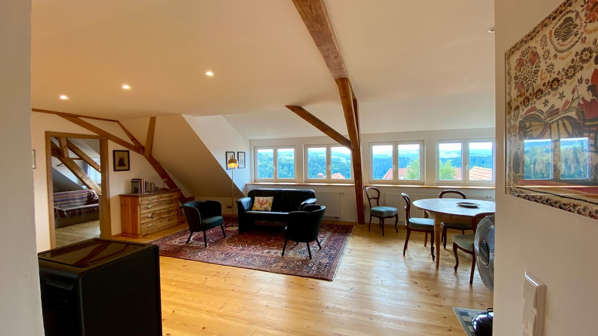 El apartamento está situado en el ático de una casa de la Selva Negra con un jardín de granja en un campo idílico y animado entre el borde del bosque y las granjas. El luminoso y soleado apartamento fue completamente renovado y elegantemente amueblado en 2020. Magníficas vistas al Feldberg, sobre prados y al pueblo de Eschbach. Especialidades de té para darte la bienvenida. Habitación con cerradura para bicicletas y equipamiento deportivo. Parada de autobús en las inmediaciones, las tiendas para las necesidades diarias están a 2 km.