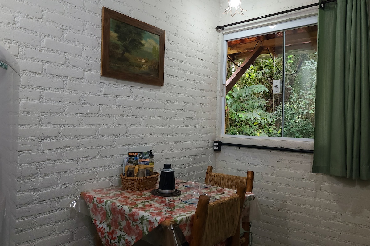 Nuestra casa de campo ofrece mucha calidez en una encantadora zona rural rodeada de naturaleza a solo 6 minutos del centro de la ciudad. Cuenta con un encantador altillo con cama tamaño queen, TV con streaming y cortinas opacas. Abajo, un sofá cama doble, cocina súper equipada, horno eléctrico, microondas, bañera con vistas a la vegetación y 300 mega de internet. El balcón es una atracción separada, con una hamaca y una mesa de café. La gran área verde y el cielo estrellado por la noche completan la experiencia perfecta para días de relajación.