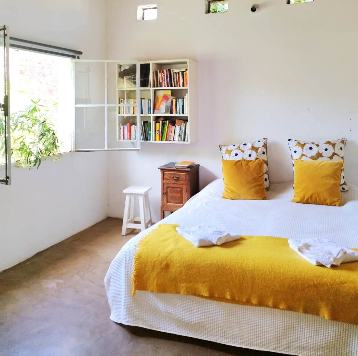 Estudio encantador, rústico, muy luminoso, restaurado con originales puertas y ventanas. El estudio es totalmente independiente con entrada privada. Tenemos una cama doble y una cama victoriana original del siglo IX de una plaza, un ventilador de techo y en extremidad de temperatura se puede utilizar el aire acondicionado. Mismo para cuando hace frío contamos con una estufa eskabe y Salamandra. Contamos con un microondas para calentar comida rápida y una heladera para poner las bebidas frescas.