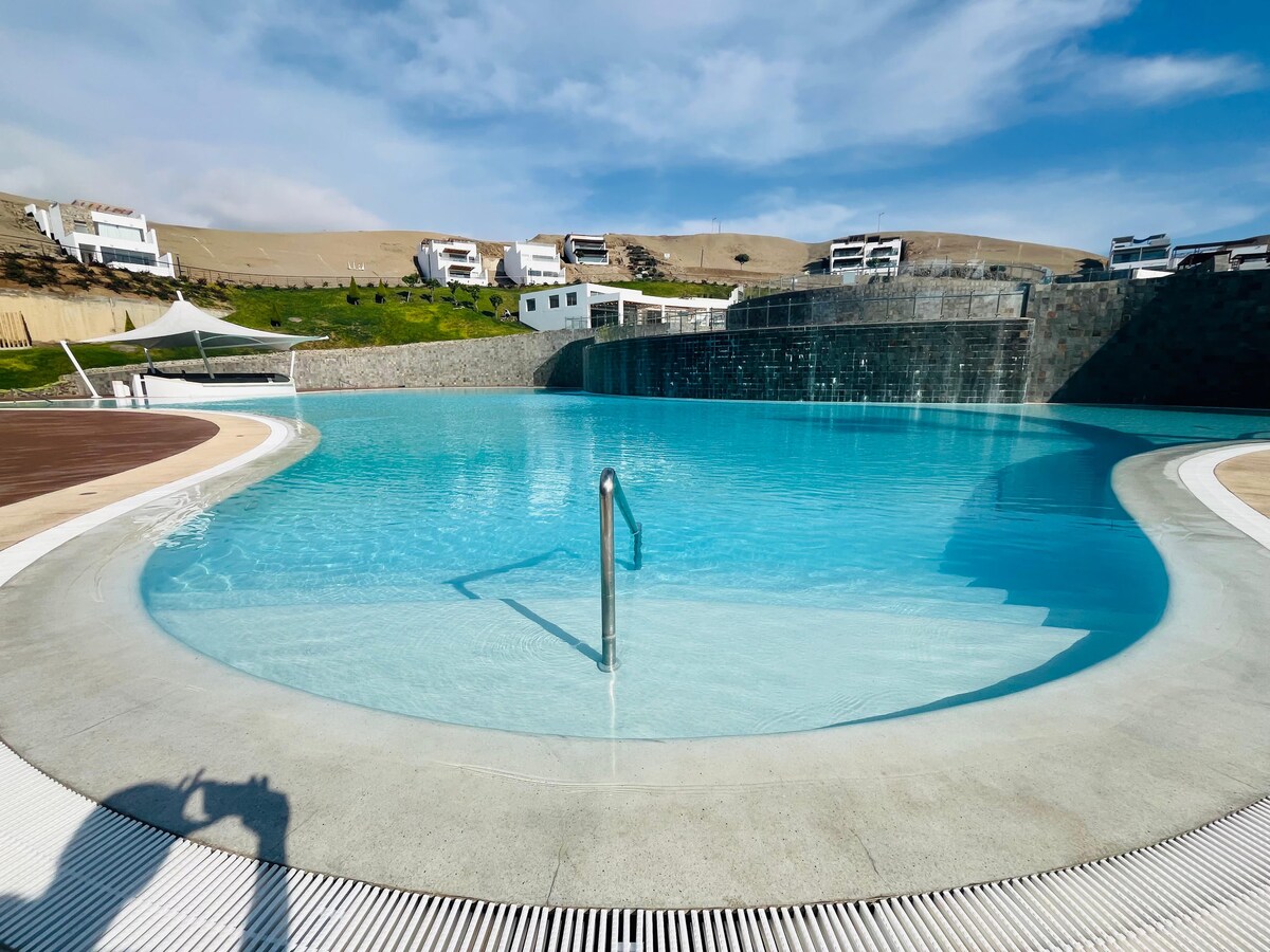 Acogedor y lindo departamento de playa ubicado en el Km 92.5 de la panamericana sur. A 5 minutos del boulevard de Asia. Con todas las comodidades de un departamento en ciudad (incluyendo smart Tv, Cable, plataformas streaming y wifi), rodeado de hermosas playas. Ubicado al interior de un moderno y seguro condominio que da directo a la playa, con servicio de seguridad y mantenimiento todo el año. Cerca de minimarkets y restaurantes que funcionan todo el año.