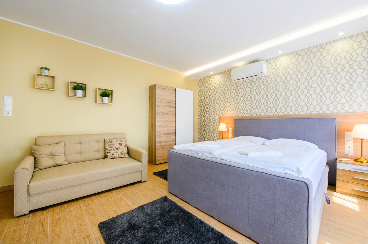 Departamento en el centro de Sopron amueblado con muebles de primera calidad. Hay 2 tipos de habitaciones, una para 2 personas/ 42 m2 , la otra para 4 personas/ 72 m2 . Ambos apartamentos están ubicados en la planta baja dentro de la casa. El alojamiento es ideal para un máximo de 2 o 4 personas, ¡y se puede solicitar una cuna y una cama supletoria! También es excelente para estudiantes y viajeros. Se encuentra justo en el centro de la ciudad, pero se encuentra en una calle tranquila y acogedora. Este lugar especial está cerca de todo, lo que facilita la planificación de tu visita a la ciudad.