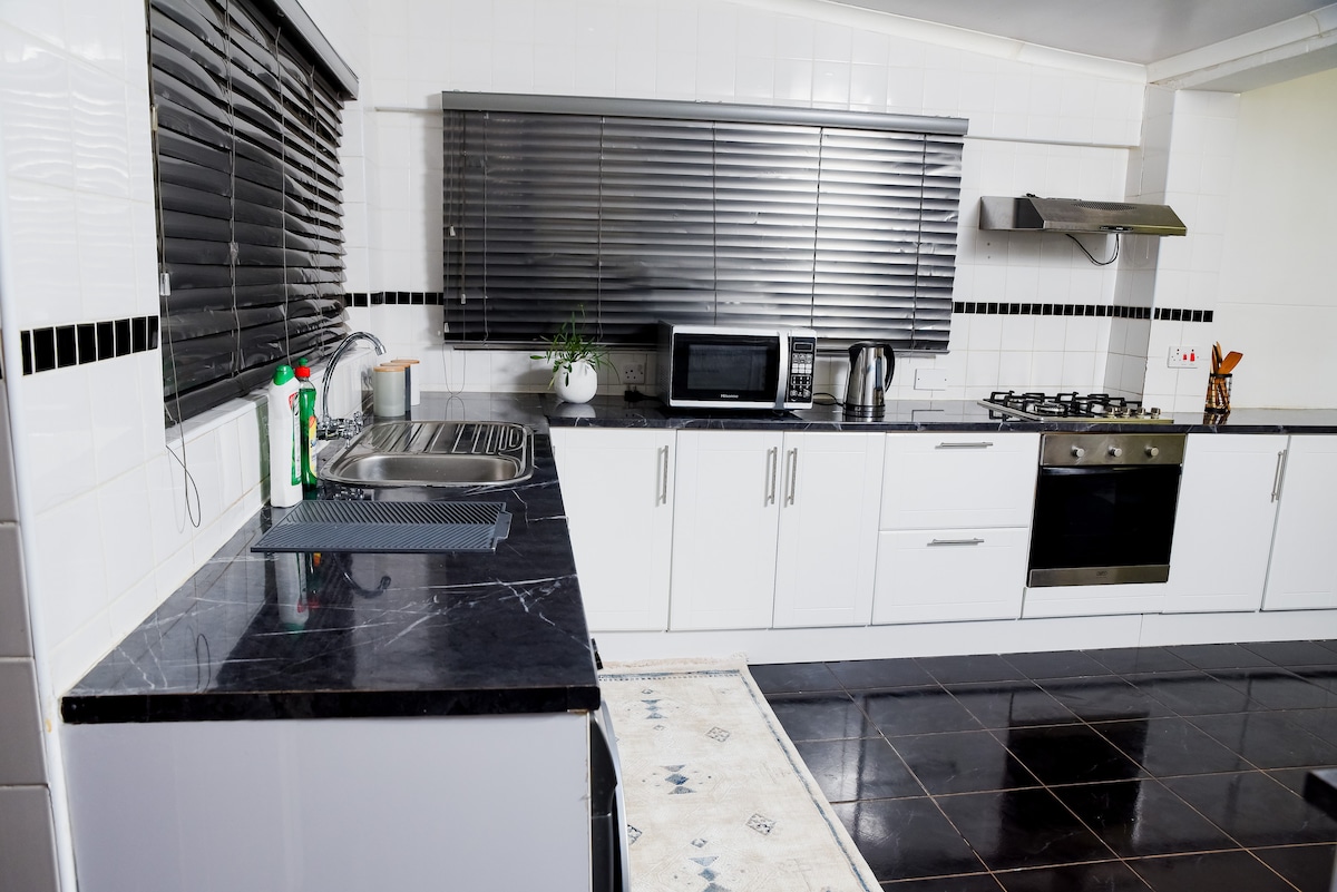 Three bedroomed house (MES) in a quiet neighborhood with a mid sized pool. Offers high speed uncapped wifi and two bedrooms are equipped with smart TVs with Netflix access. Comfortable work space for business travelers. Fully equipped kitchen, solar and generator back up- trampoline for kids, very ideal for families. Very secure with rapid response. Property manager available 24/7. Complimentary airport pick ups and special car hire rates for guests.