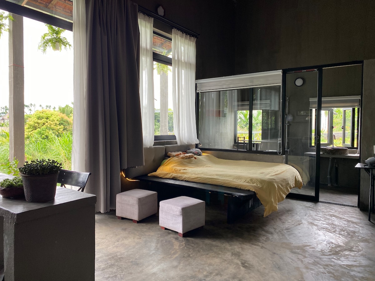 Sin smog, sin sonidos de automóviles, solo pájaros cantando, sol a través del dosel y mañanas inmaculadas. Un lugar lo suficientemente cerca como para ser fácil de ir, suficiente espacio para alejarse temporalmente de la ciudad, para reducir la velocidad y respirar un poco más profundo. La casa de madera rústica está en el jardín verde con muchos árboles verdes y diferentes frutas (yaca, limón, coco, aguacate, durián, mango, macca...) completamente orgánicas. Según la temporada, puedes elegir la fruta en el lugar y disfrutar: siente la dulzura de la naturaleza.