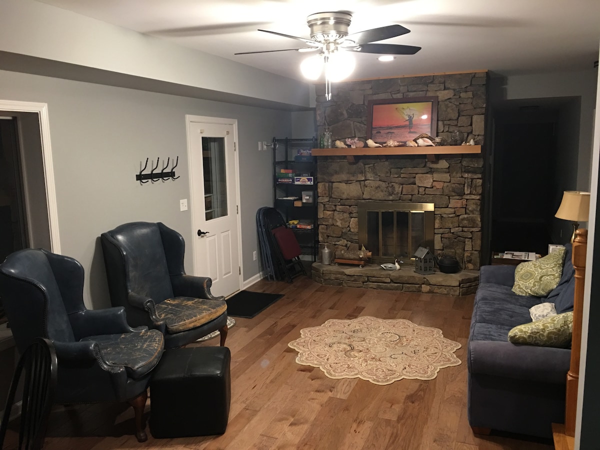 Impresionantes vistas a las tranquilas montañas desde la suite de invitados de nivel inferior, a una milla de Burnsville, Carolina del Norte. 4 dormitorios, 1 baño en un apartamento de nivel inferior renovado con entrada privada. 1 cama tamaño king, 1 queen, 1 cama completa y 1 litera, futón y cuna, parque infantil. Calefacción, aire acondicionado. Apto para niños y bebés. Cocina pequeña, comedor y chimenea en la sala común. Patio. Lavadora y secadora. Barrio tranquilo en un entorno pastoral con unas vistas increíbles. Cerca de Asheville y de actividades al aire libre. ¡Bienvenidos todos!