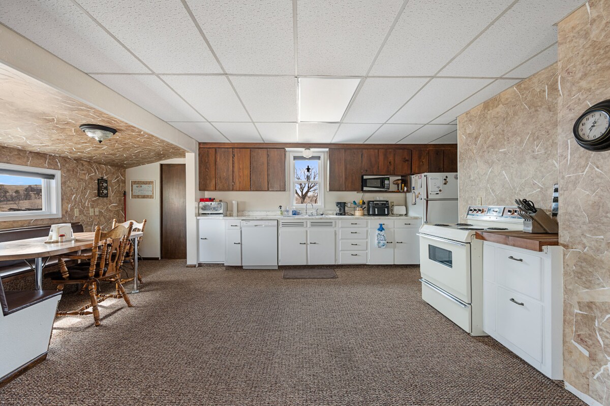 La casa de troncos se encuentra en 360 acres de tierra con Horse Creek corriendo a través de ella. La mayoría de las mañanas, la vida silvestre aparecerá, como ciervos, zorros, faisanes y otras aves. La casa tiene grandes ventanales con hermosas vistas a las Colinas Negras a lo lejos. La zona principal tiene un techo de catedral con luces de ruedas de vagón. El segundo piso tiene el dormitorio principal, dormitorio pequeño, área de juego y baño completo. El piso principal tiene tres dormitorios, baño, lavadero, cocina, comedor y sala de estar.