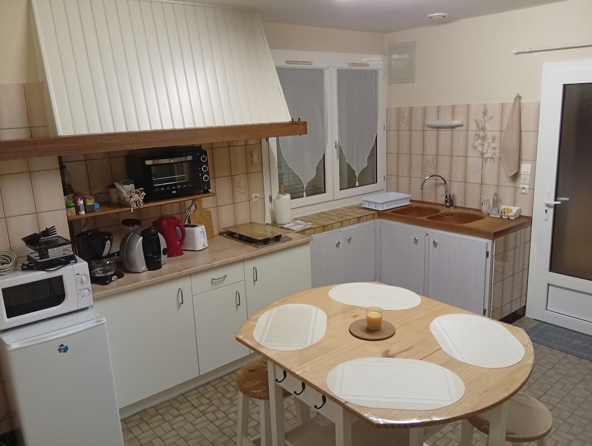 Una casa de campo de 80 m2 para darle la bienvenida con sus 2 dormitorios (sábanas y toallas incluidas) con cama doble en la planta baja. Relájese en el salón con sofás, mecedora, pantalla grande... Cocina amueblada y equipada con un segundo televisor. El baño está equipado con una gran cabina de ducha con 2 lavabos. Jardín, tumbonas, pista de petanca, terrazas y barbacoas, ¡relájese! Conexión wifi para los trabajadores. Patio privado, sus coches están seguros.