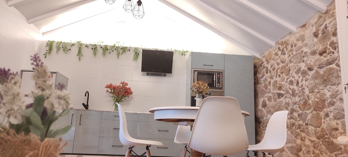 Piso estilo Loft. Cuenta con una habitación con cama de matrimonio , salón – cocina, cuarto de baño y vestidor. TV, Lavadora, Lavavajillas, Aire Acondicionado (climatizador), chimenea de pellets, WIFI y bañera de hidromasaje. Situado en un entorno rural, tranquilo y muy bien comunicado con los accesos a la autovía del Salnés y Autopista AP 9, que comunican O Mosteiro con las principales ciudades y pueblos de las Rías Baixas. Ideal para parejas y singles. Se recomienda coche para desplazarse.
