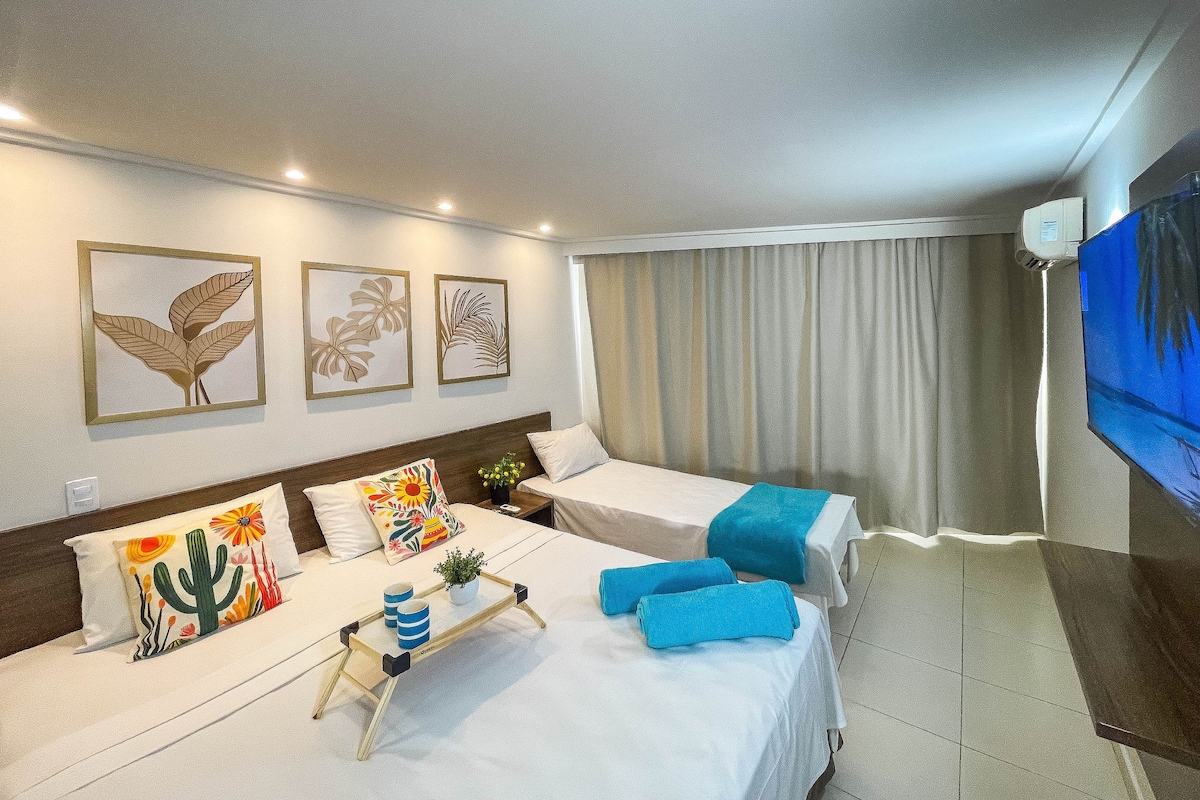 Situado en el cuarto piso, el apartamento tiene un gran balcón con vistas al mar. La suite cuenta con aire acondicionado, cortina opaca y gabinetes. La cocina está equipada con minibar, microondas, sandwichera, licuadora y utensilios esenciales para comidas pequeñas. Ofrecemos desayuno en el edificio. Recibirás el apartamento desinfectado, con cama montada, toallas de baño, todo preparado para tu estancia para que sea cómoda e inolvidable. ¡Viva lo mejor de João Pessoa!