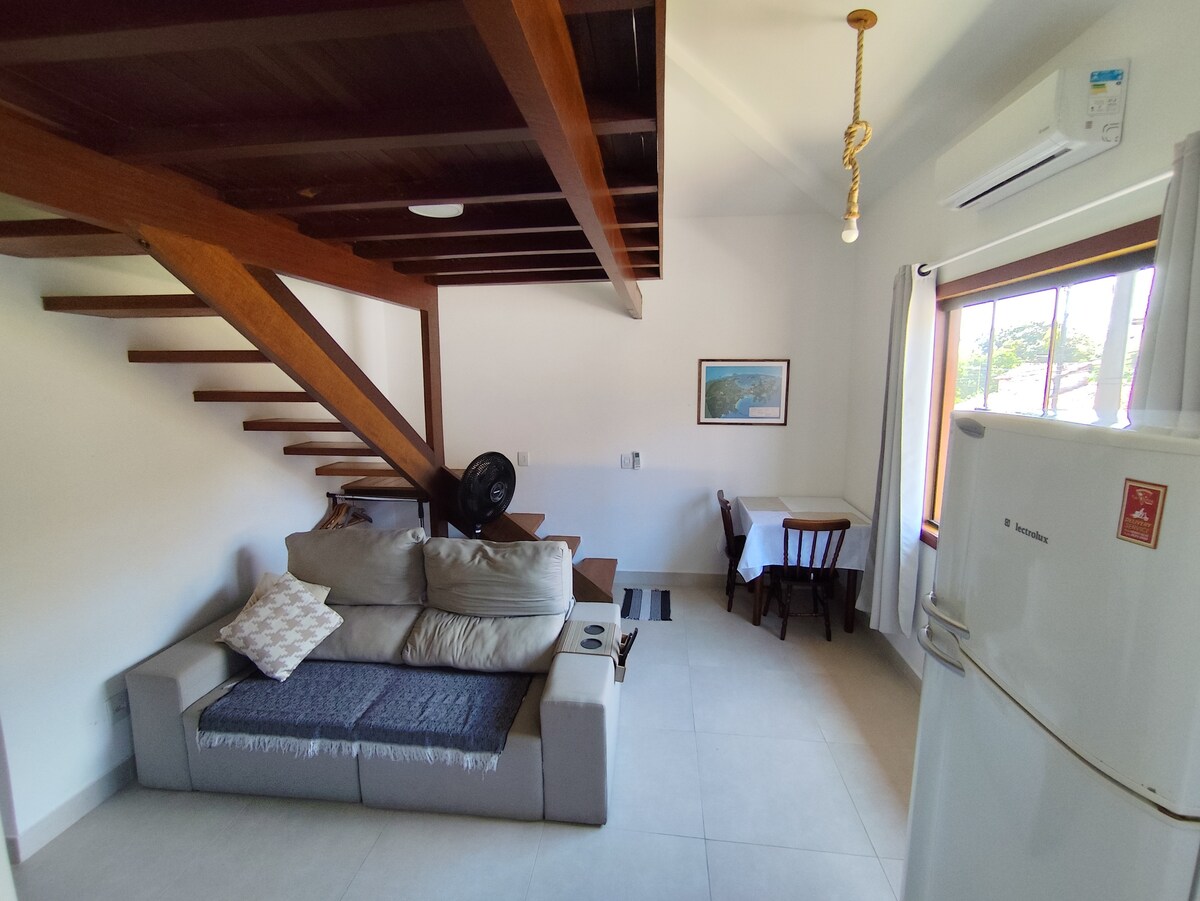 Loft para até 4 pessoas em um excelente condomínio em Geribá - Búzios, com piscina, sauna e estacionamento, a menos de 5 minutos da praia! Quarto equipado com uma cama de casal e uma de solteiro, SmartTV, ar condicionado split, cortina e armário. Na sala, além do ar condicionado e Smartv, temos tv à cabo, um sofá cama e um sofá que se necessário, vira uma cama de solteiro. Cozinha equipada com geladeira, fogão, microondas e utensílios domésticos. Internet da Claro para sua comodidade.