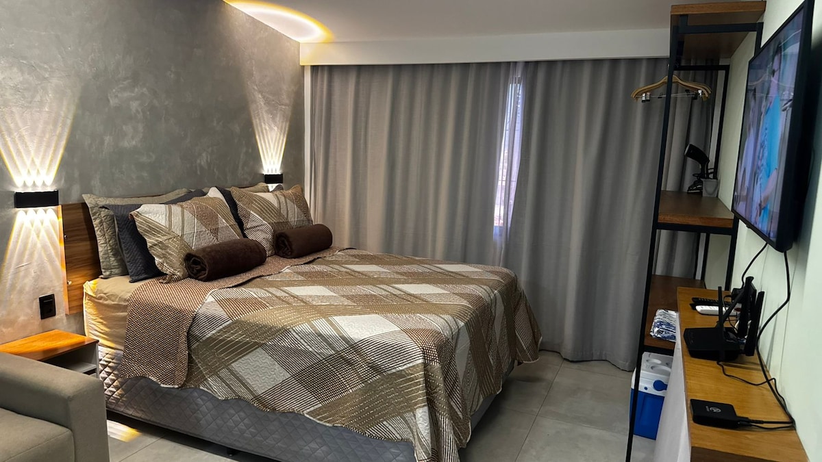 Derecho a utilizar todos los servicios del hotel, como piscina y sauna. Estacionamiento (R$ 35.00 por noche, dependiendo de la disponibilidad y desayuno (R$ 40.00 por persona). A 5 minutos de los mejores restaurantes de la ciudad, a 3 minutos del centro y a 10 minutos de la playa (a pie). Los niños de hasta 12 años se alojarán en la cama existente en la habitación o en un colchón, sin costo adicional. ¡ATENCIÓN ! Es un apartamento dentro de un hotel, pero te alojas a través de Airbnb No se ofrece servicio de hotel.