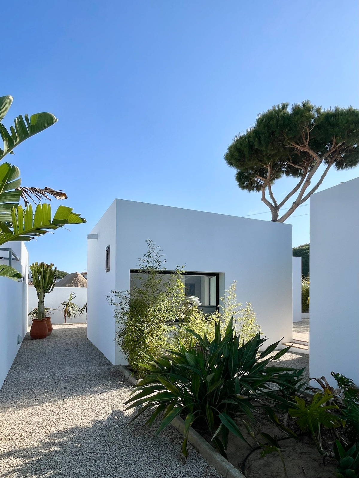 En el idílico poblado de Zahora – Caños de Meca, a solo 10 minutos andando de las playas de Zahora se encuentra casasblancas-zahora. CASA BLANCA 1 se encuentra dentro de un jardín de 1000 m2, formando un conjunto de cuatro unidades, con acceso a través de un parking común. Con la luz y las vistas al jardín como protagonistas es de estilo minimalista, con grandes acristalamientos, formada por dos volúmenes blancos, que crean un gran patio–jardín privado con vegetación propia.