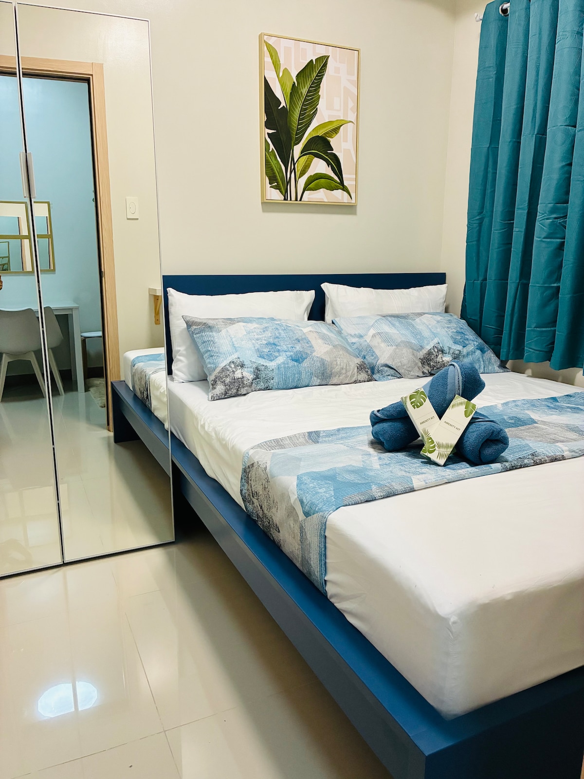 📍 Stylish 34sqm studio designed for comfort and convenience: Queen-sized bed Double-size airbed 65” Google TV, PS4 Pro, and board games Fully equipped kitchen and dining area Modern lighting and built-in outlets 🏖 Amenities: FREE pool access Fitness gym Basketball court Jogging trail Secure paid parking & 24/7 security 🧴 Guest Kit Provided: Dental kit Round soap Slippers Bath towel ⚠️Note: Tissue and dishwashing liquid are not included. 🔑 Hassle free self check-in and check-out.