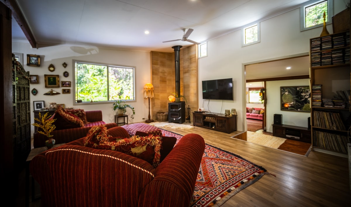 Ubicada en una exuberante selva tropical, nuestra espaciosa casa construida a mano es un refugio sereno hecho con amor. Situado junto a la carretera principal, pero cerca de las atracciones, estamos a 40 minutos del centro de Cairns y a 5 minutos de Kuranda Village. Explora la Gran Barrera de Coral, lagos y cascadas, y luego relájate en nuestra amplia terraza. Disfruta de la paz y la tranquilidad que ofrece nuestro hogar, ya sea tomando café por la mañana o vino por la noche. Experimenta el encanto único y la belleza natural de nuestro santuario de selva tropical.