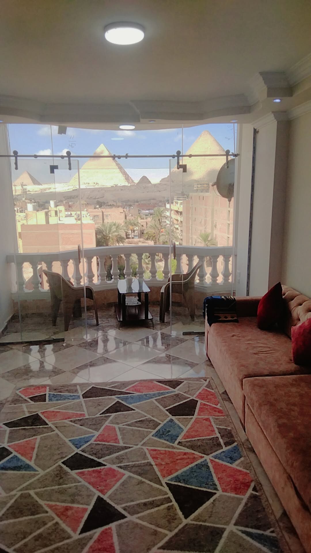 Our apartment is located near the three pyramids and the Sphinx, 10 minutes away. What a wonderful view from the balcony. The apartment is considered a starting point for all your tourist trips.Local market nearby: supermarket, pharmacy, restaurants, tourist bazaars