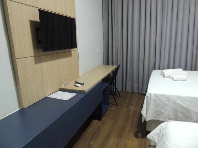 Acomodação com tres camas de solteiro, ar condicionado, frigobar vazio, tv, internet, banheiro privativo, mesa e cadeira. Inclui café da manhã.