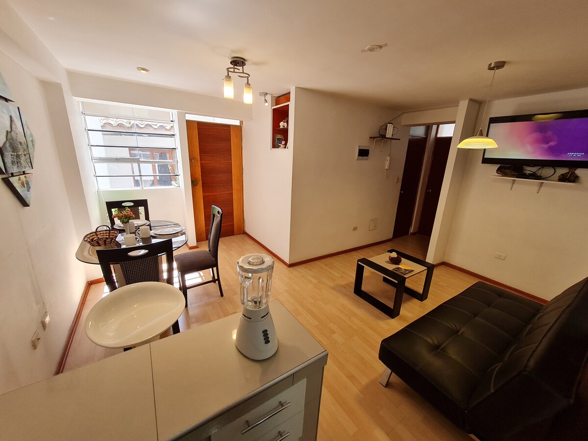 El apartamento se ubica en una zona céntrica de Cusco, donde podrás encontrar muy cerca supermercados, restaurantes, farmacias, entidades bancarias y financieras, casas de cambio, clínicas de salud y otros, decoración moderna sencilla, funcional, acogedor y bien iluminado. Sala con biblioteca, Wifi, Netflix, Cable mágico, sofás confortables, moderna cocina y comedor totalmente equipado, duchas con abundante agua caliente las 24 horas, terraza con sombrilla y vista panorámica de la ciudad.