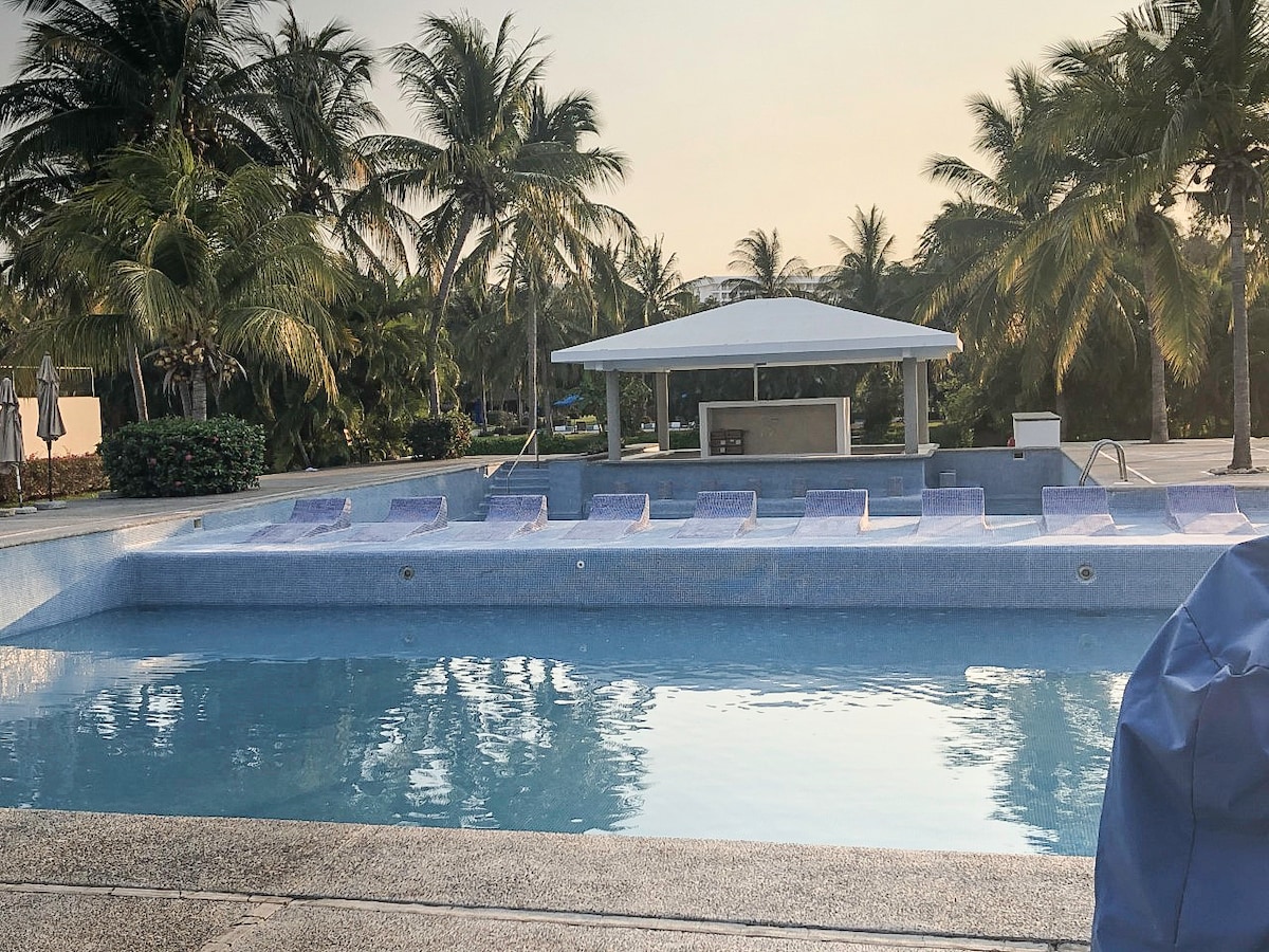 Departamento a pie de Playa, con vista a la bahía más hermosa del mundo. Rodeado de restaurantes, bares, tiendas y bancos a los que puedes llegar caminando. En el complejo podrás relajarte y disfrutar de albercas, amenidades (gimnasio profesional, jacuzzi, billar, etc.) y acceso a la playa dorada de aguas tranquilas. El depa está totalmente equipado con todo lo necesario para cocinar, descansar y trabajar con WiFi. A solo 10 mins. de zona Diamante y 20 mins. del aeropuerto por el Macrotúnel.