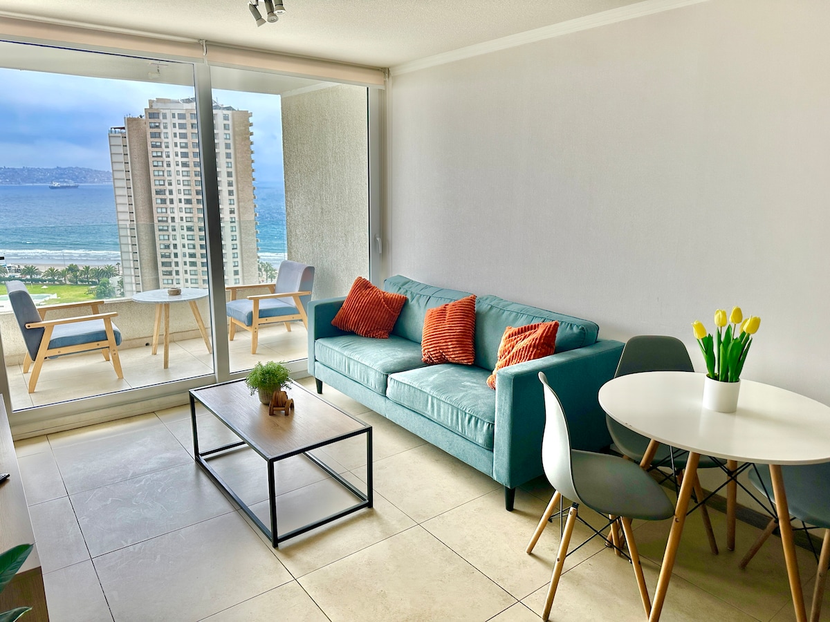 Lindo y comodo departamento de 1 dormitorio ubicado en plena Avenida del Mar, en un 5to piso frente al mar, se encuentra a solo 7 minutos caminando del casino y en su entorno cercano hay cafés, pubs, restaurant y minimarket. Nos preocupamos de cada detalle de su decoración, como también que cuente con buenos colchones y estamos mes a mes renovando el lugar. Cuenta con estacionamiento cubierto y wifi.