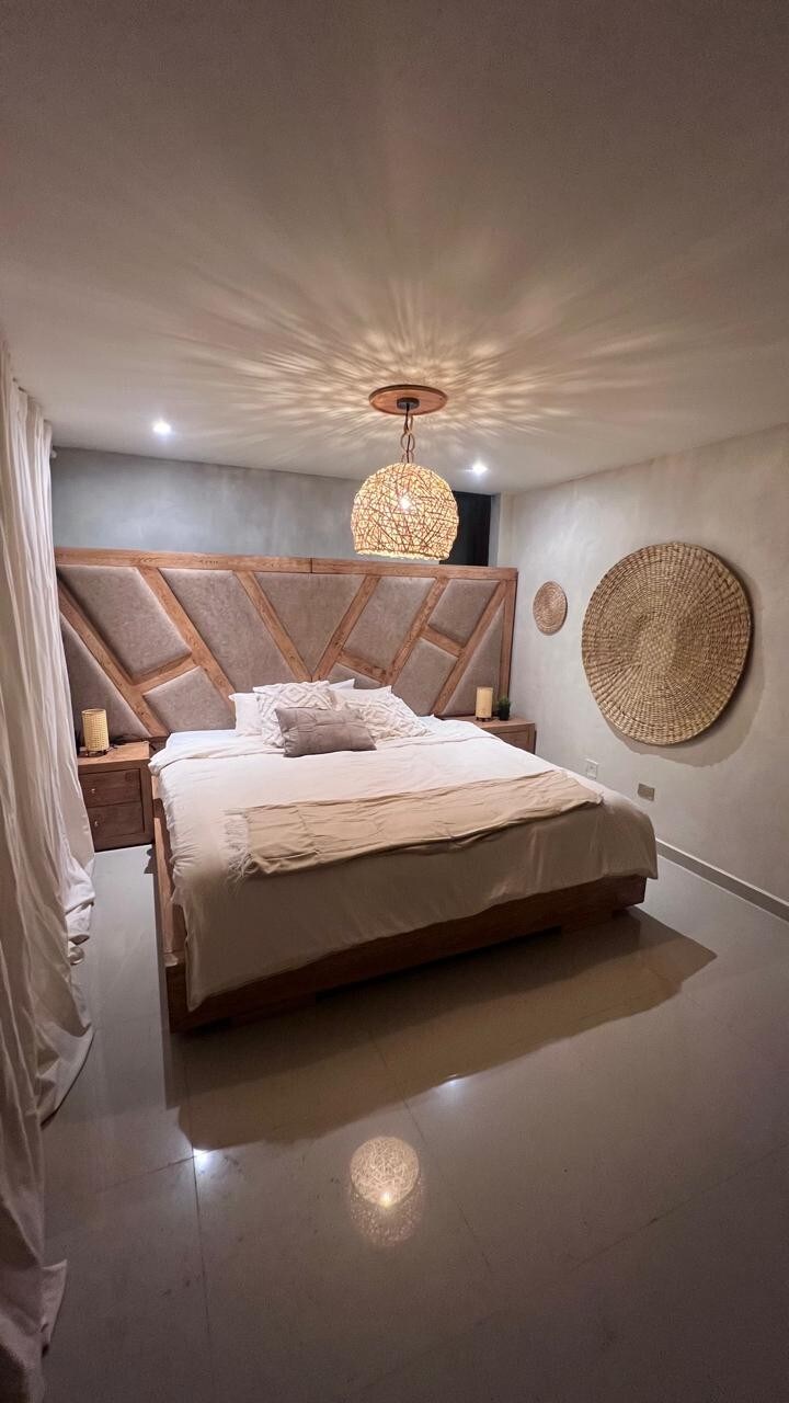 ¡Feliz de recibirte en este hermoso y lujoso apartamento que personalmente he diseñado para tu disfrute, placer y confort! Vive las noches más románticas y/o regálate paz y descanso en este amplio y agradable alojamiento de estilo rústico moderno, con piso de madera, bañera y jardín privado. Posee además un espacio ideal para quienes practican meditación, así como 2 hamacas para tu descanso y para disfrutar en pareja. Tiene un comedor interno y otro en el jardín, al frente de la fogata.