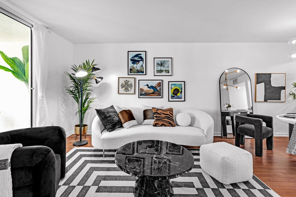 Apartamento de lujo entero en Quadro, en el Distrito de Diseño. Totalmente equipado: estacionamiento gratuito, café, wifi y cable. El edificio cuenta con comodidades en el sexto piso que incluyen un gimnasio, un salón con área de coworking y una sala de juegos, un comedor al aire libre con barbacoas y una gran piscina. ¡Camine a cientos de tiendas de diseño, restaurantes, bares, galerías de arte y más! A 10 minutos en coche del aeropuerto internacional de Miami, a 15 minutos en coche de Miami Beach.