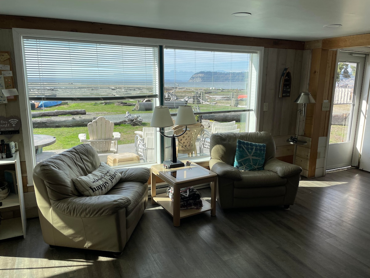 Disfruta de impresionantes vistas del estrecho y de las montañas Olímpicas mientras te relajas en una de las tres cubiertas de nuestra casa frente al mar recientemente remodelada. Nuestra moderna casa de playa cuenta con tres espaciosos dormitorios en la planta superior alrededor de una sala de estar independiente, un gran salón y comedor en la planta baja y baños en ambos niveles. Puedes ver focas, águilas calvas y ballenas mientras caminas por los escalones de la playa sin banco desde nuestra puerta principal. Bebe vino alrededor de la chimenea de propano mientras disfrutas de la magnífica puesta de sol.